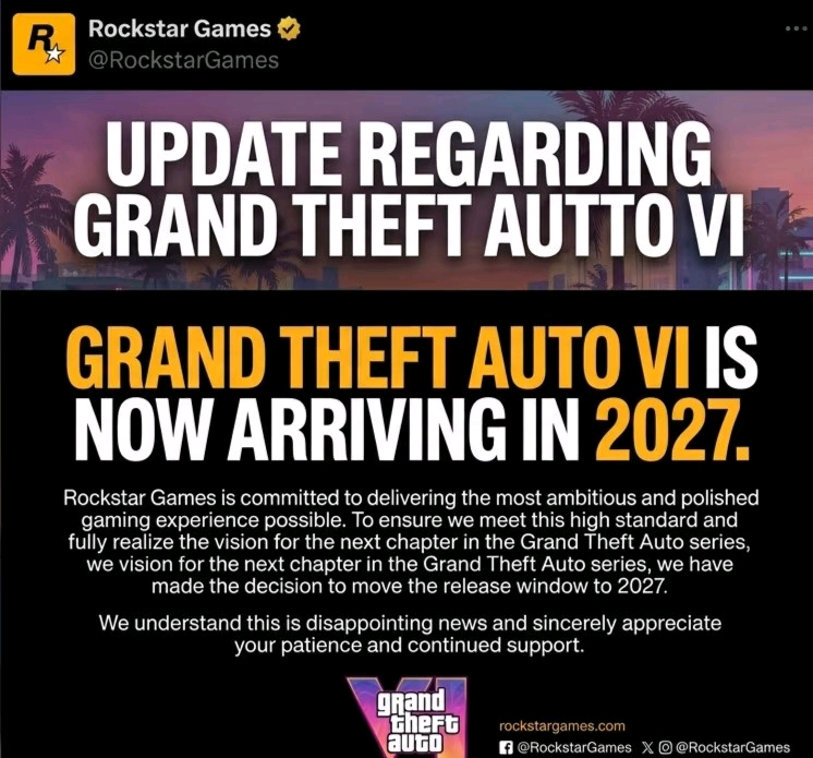 GTA6已确认延期至2027年4月29日发售R星发文 |
